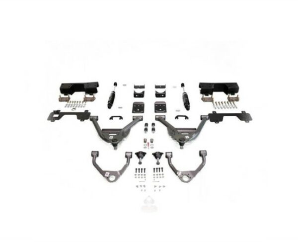 IHC Suspension’s 2014-2018 GM 1500 Extended/ Crew Cab 5/7 lowering kit consists of upper and lower control arms. You achieve the drop with the lower control arm and the upper is for alignment correction. Spacers are included to adjust front control arms from 5” to 4” without purchasing any more parts. Shorter sway bar links are included for better sway bar angle. The rear consists of a flip kit with the correct pinion angle built-in, so NO pinion shims are needed. Nitrogen drop shocks included. C-notch is required. IHC includes bolt on under-bed C-notch that requires no welding for your DIY.